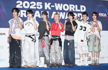 그룹 킥플립이 21일 오후 서울 송파구 잠실 실내체육관에서 열린 '2025 케이 월드 드림 어워즈( K-WORLD DREAM AWARDS 2025)' 블루카펫에서 포즈를 취하고 있다.