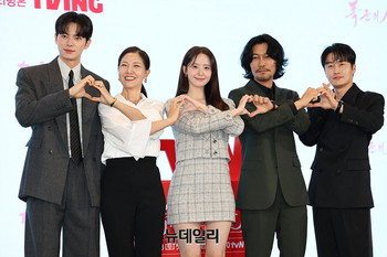 배우 이채민(왼쪽부터), 서이숙, 임윤아, 최귀화, 오의식이 19일 오후 서울 구로구 더세인트에서 열린 tvN 드라마 '폭군의 셰프(연출 장태유)' 제작보고회에서 포즈를 취하고 있다. '폭군의 셰프'는 동명의 웹소설 원작으로 폭군이자 절대 미각을 가진 왕인 연