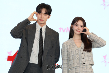 배우 임윤아, 이채민이 19일 오후 서울 구로구 더세인트에서 열린 tvN 드라마 '폭군의 셰프(연출 장태유)' 제작보고회에서 포즈를 취하고 있다. '폭군의 셰프'는 동명의 웹소설 원작으로 폭군이자 절대 미각을 가진 왕인 연희군 이헌(이채민 분)과 미래에서 온