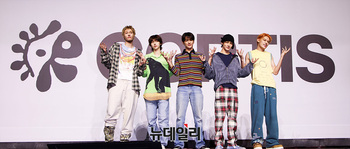 신인 보이그룹 코르티스(CORTIS) 마틴, 주훈, 건호, 성현, 제임스가 18일 오후 서울 용산구 블루스퀘어에서 열린 데뷔 쇼케이스에서 포즈를 취하고 있다.이번 앨범은 타이틀곡 '왓 유 원트(What You Want)'를 포함해 '고!(GO!)' '패션(FaSHioN