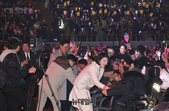 배현진 국민의힘 의원이 8일 오후 서울 송파구 잠실실내체육관에서 열린 한동훈 전 대표 토크콘서트에 참석하며 인사를 나누고 있다.
