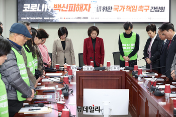 나경원 국민의힘 의원 등 참석자들이 13일 국회 의원회관에서 열린 '코로나19 백신 피해자를 위한 국가 책임 촉구 간담회'에서 피해자에 대한 묵념을 하고 있다.