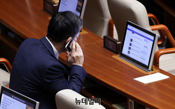 정성호 법무부 장관이 12일 오전 서울 여의도 국회 본회의장에 자리하고 있다.