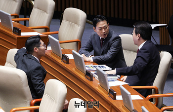 장동혁 국민의힘 대표, 박준태 의원, 신동욱 의원이 12일 오전 서울 여의도 국회 본회의장에서 대화를 나누고 있다.