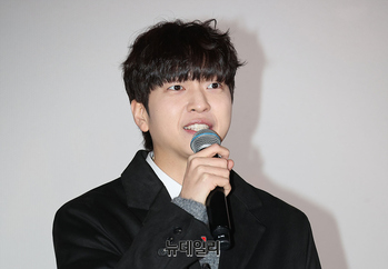 개그맨 유재필이 11일 오후 서울 강남구 CGV 압구정에서 열린 최예나 5번째 미니앨범 러브캐쳐 기자간담회에서 인사말을 하고 있다. 이번 앨범은 타이틀곡 '캐치캐치'를 포함해 5트랙을 담았다.