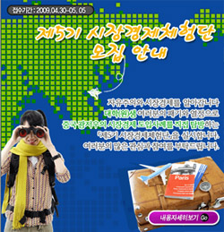 자유기업원(http://www.cfe.org)은 '시장경제 도입 후 중국의 경제성장을 견인해 온 광저우의 현재와 미래'라는 탐방 슬로건을 내걸고 전국 대학생(대학원생 포함)을 상대로 '제 5기 시장경제체험단'을 모집한다. 시장경제체험단은 오는 7월 5일에서 10일까지 5박 6일간 중국 광저우를 직접 찾아가 시장경제 도입사례를 탐방한다. 자유기업원은 해외탐방에 필요한 항공료, 숙박비 및 소정의 활동비를 지급하고 탐방 후 우수논문을 제출한 학생에게는 상패와 장학금도 지급한다.