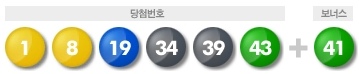제341회차 나눔 로또당첨번호는 1, 8, 19, 34, 39, 43번으로 추첨됐다. 보너스 번호는 41번이다.
