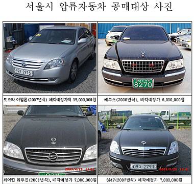 그동안 서울시에서는 압류자동차에 대하여 인터넷공매를 주기적으로 실시해 왔으나, 이번 자동차공매는 감정가액 3500만원의 도요타 아발론을 비롯해 에쿠스, 오피러스, SM7, 그랜져 등 고급 외제차 및 대형차량들이 주요 공매물건으로 선보일 예정이다.