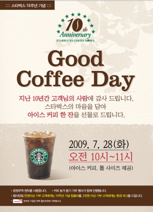 ㈜스타벅스커피 코리아(대표 이석구)가 1호점 개점 10주년을 맞아 오는 28일 오전 10시부터 11시까지 전국 35개 도시 300여 매장에서 무료 커피 제공 행사를 동시 진행한다.