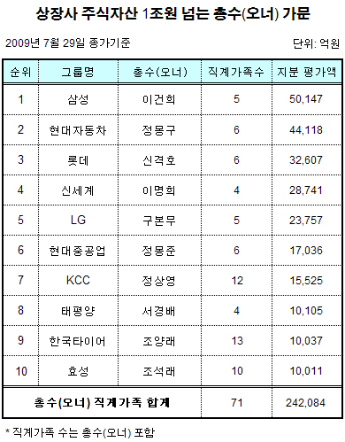 30일 재벌닷컴이 재계 총수(오너) 및 직계가족이 보유한 상장사 주식지분 가치를 전 날인 29일 종가 기준으로 평가한 결과 1조원을 넘은 ’주식갑부’ 가문은 10곳으로 집계됐다.