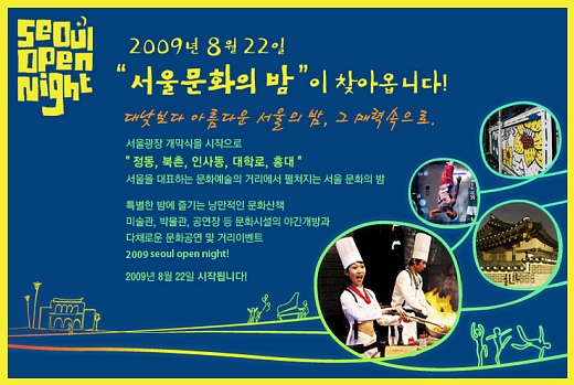 서울시는 22일을 ‘서울 문화의 밤(Seoul Open Night)’으로 정하고 이날 오후 2시부터 밤 12시까지 정동, 북촌, 대학로, 인사동, 홍대의 5개 지역에서 다양한 문화행사를 연다고 3일 밝혔다.