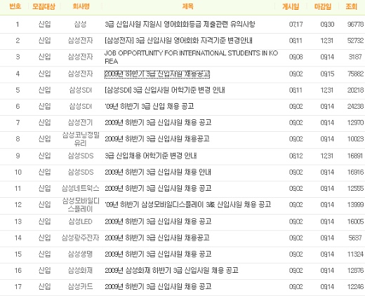 삼성그룹 주요 계열사의 대졸신입사원 채용 접수가 14일 오후 5시에 마감됨에 따라 응시생들이 대거 삼성의 채용 사이트인 디어삼성(www.dearsamsung.co.kr)에 몰려 '디어삼성'이라는 이름이 포털검색어 순위 상위에 오르는 현상이 발생하고 있다.