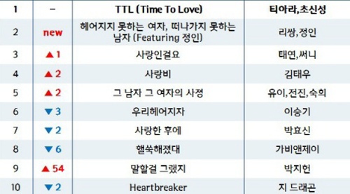 그러나 지난 주 2위에 머물렀던 가비앤제이의 ‘헬쑥해졌대’는 6단계 하락한 8위를 기록했으며 산다라, 씨엘의 'Kiss'도 6단계 하락하면서 18위에 올랐다.