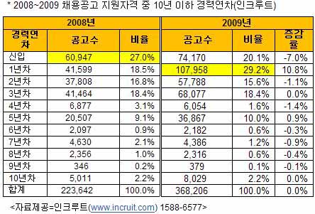 2008년에는 10년차 이하 채용 공고수가 모두 22만3642건이었는데 이 중 가장 많았던 경력연차는 ▶ '신입'(6만947건)으로 전체 채용공고의 27.0%를 차지했고 이어 경력 '1년차'(4만1599건)가 18.5%로 그 뒤를 이었다. 하지만 올해 들어서는 '1년차' 비중이 크게 높아졌다. 이에 비해 올해 10월까지 10년차 미만 채용 공고 수 36만8206건 가운데서는 29.2%에 해당하는 10만7958건이 '1년차' 모집을 지원 자격으로 공고를 올렸다. 이는 작년에 비해 10.8%p 급등한 수치로 올해 전체 채용공고 10건중 3건은 '1년차' 경력자 모집 공고였다는 뜻으로 볼 수 있다.