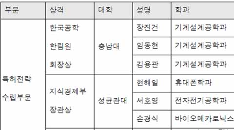 한국공학한림원(회장 윤종용)과 특허청(청장 고정식)이 공동 주관한 '2009 캠퍼스 특허전략 유니버시아드' 대회 특허전략부문에서 충남대 팀(장진건 임동현 김용관)이 최고상인 한국공학한림원 회장상을, 성균관대 팀(현해일 서호영 손경식)이 지식경제부 장관상을 각각 수상했다. 또 지난 7월 선행기술부문에서 지식경제부 장관상이 결정된 김경난씨(경희대)는 특허전략부문에서 특허청장상까지 받아 2관왕이 됐다. 시상식은 26일 서울 장충동 신라호텔에서 열렸다.