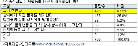 그렇다면 직장인들은 이러한 직속상사의 ‘문제행동’에 어떻게 대처하고 있을까. 가장 높은 응답률을 보인 것은 ‘그냥 참는다’(63.2%)였다. 가장 가까이에서 자신의 업무를 평가하는 직속상사이므로 적극적으로 대응하기 보다는 속으로 삭히는 직장인이 대부분인 셈이다. 그러나 ‘상사에게 직접 문제를 제기한다’(25.0%)는 용감한(?) 직장인도 적지 않았다. -