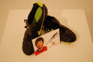 박지성의 영문 이니셜(JS PARK)이 새겨져 있는 이 축구화(사진)는 박지성이 직접 신고 뛰었던 나이키 제품으로 검정색 바탕에 노란색 제품 로고가 새겨져 있다. 박지성의 발 크기는 260mm다.