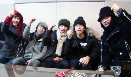 지난 13일 오후, 2AM의 공식홈페이지(http://2am.jype.com)에 공개된 동영상은 2AM의 신곡을 이어폰으로 듣고 있는 2PM의 멤버 닉쿤, 우영, 준호, 찬성, 준수의 모습을 담고 있다(사진).
