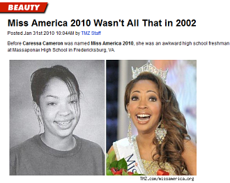 미국 연예매체 TMZ닷컴은 지난달 31일자 보도(사진)를 통해 '미스 아메리카가 되기 전 카레사 카메론'이라는 제하의 사진을 전격 공개했다. 사진 속 카메론은 당시 14살의 나이로 '치아교정기'를 낀 채 지금과는 사뭇 다른 수수한 얼굴을 하고 있었다. 특히 미스 아메리카에 당선된 현재의 눈보다 상대적으로 작은 눈과 무딘 콧날을 지녀 성형 의혹 가능성이 짙게 배어있는 것이 사실.