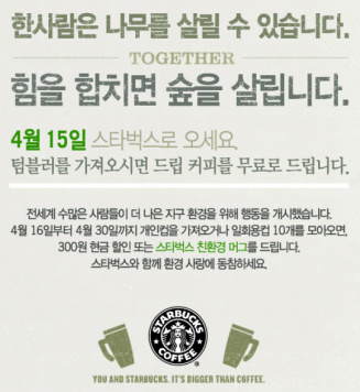 스타벅스코리아는 4월 22일 제40회 지구의 날을 기념, 음료를 머그로 주문시 50원씩 환경기금을 적립하기로 했다. 올해 기금 목표액은 약 1억원이며, 기금은 전액 친환경 제품으로 고객에게 환원한다.