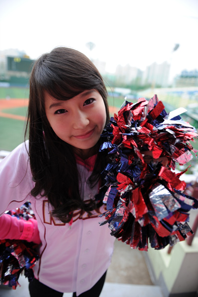 14일 서울 목동구장에서 열린 2010 프로야구 넥센 히어로즈와 롯데 자이언츠의 경기에서 시구자로 나선 중학생 치어리더 김민주(14) 양이 경기 전 응원석에서 포즈를 취하고 있다.