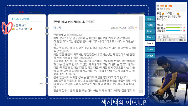 지난해 열린 쇼트트랙 국가대표 선발전 당시 휘청이는 이정수를 받쳐주는 곽윤기의 모습을 담은 동영상을 공개, '동료의 도움을 받지 않았다'는 이정수의 종전 주장을 정면으로 반박하는 주장을 제기한 쇼트트랙 국가대표 선수 성시백이 19일 밤 또다시 자신의 미니홈피에 글을 올려 "동영상을 올린 의도는 다른 쪽 의견도 있다는 것을 알리고자 한 것"이라며 지나친 확대 해석을 경계하는 목소리를 냈다(아래 사진).