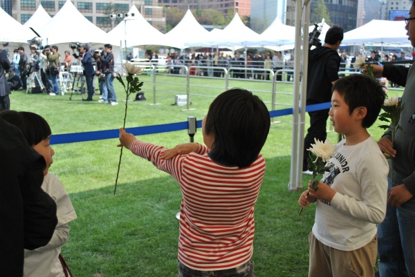 서울광장에 마련된 시민분향소를 가족들과 함께 찾은 어린이들이 상주단이 건넨 국화꽃을 받아들고 웃음꽃을 피우고 있다. 이 아이들은 과연 오늘의 평화가 어떤 이들의 희생을 대가로 얻어진다는 사실을 알고 있을까?