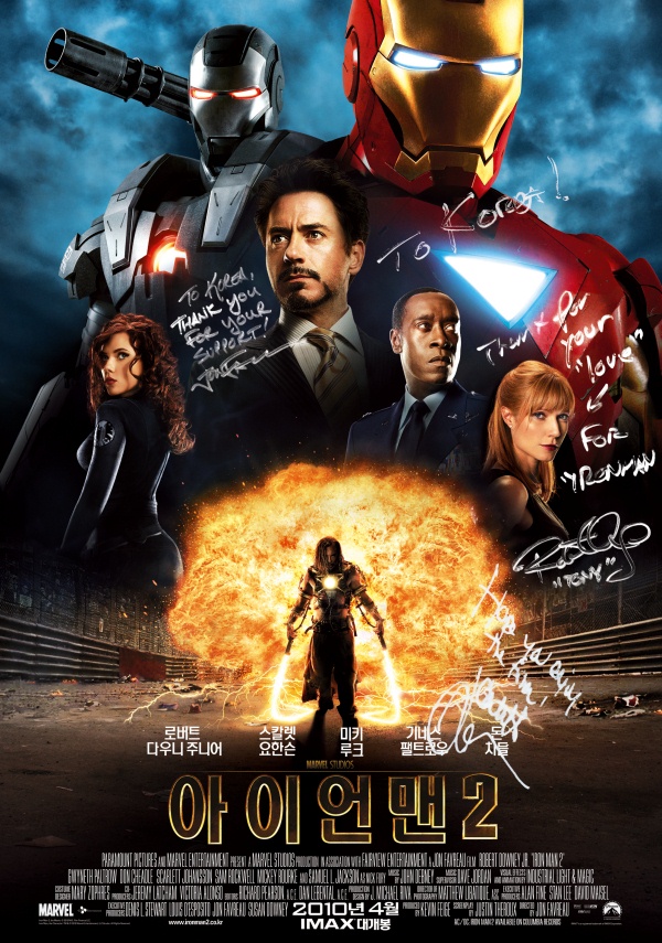 한층 업그레이드 된 볼거리와 액션, 강력한 캐릭터 군단, 그리고 스칼렛 요한슨, 미키 루크, 사무엘 잭슨 등 할리우드 최고 스타들의 합류로 개봉 열흘 전부터 예매율 1위를 기록한 블록버스터 '아이언맨2'의 출연진이 한국 팬들을 위해 특별히 친필 사인과 메시지를 남겨 화제다.