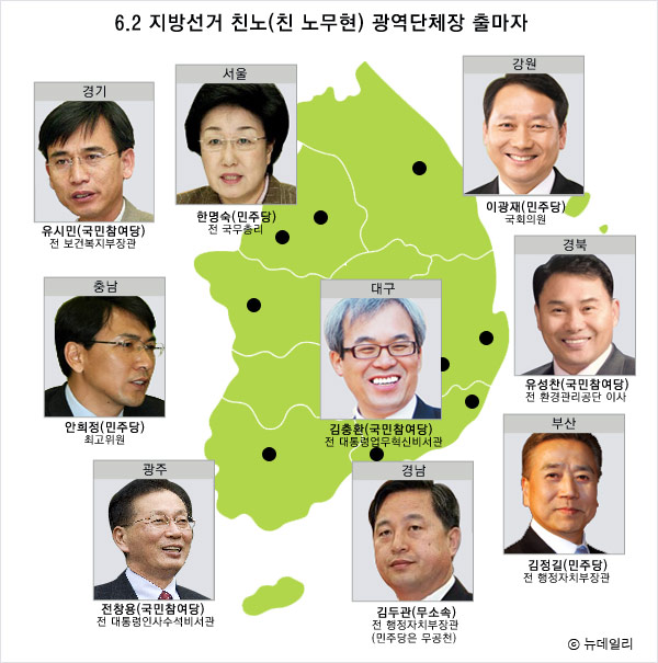 인천의 경우 송영길 후보가 낙점돼 그나마 친노색을 피했으나, 지방선거 최대의 승부처인 서울에서 한명숙 후보를 비롯, 충남(안희정·민주당), 경남(김두관·무소속), 강원(이광재·민주당)지사에 친노인사들이 다 꿰차고 앉았다. 김두관 후보는 노무현 정부 때 초대 행정자치부 장관을 지냈고 '리틀 노무현'으로 불렸으며, 충남.강원지사에 출마하는 후보 역시 '좌희정 우광재'라고 불릴 정도로 노무현 전 대통령의 측근이었다. 그야말로 6월지방선거 간판지역을 모조리 친노에 내주게 돼버린 것이다.