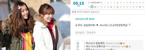 효민은 15일 자신이 미니홈피 다이어리에 "순규야 생일 축하해~♥ 써니 써니 넌 나의 영원한 햇살"이라는 글을 남겼다(사진).