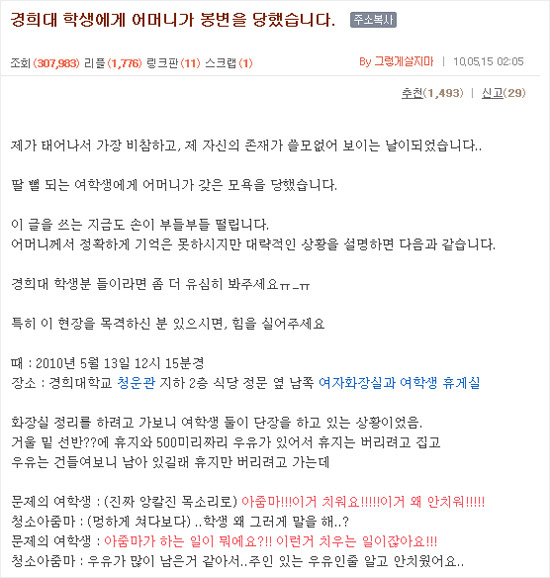 지난 15일 포털사이트 네이트 게시판에 ‘경희대 학생에게 어머니가 봉변을 당했습니다’라는 글이 올라오면서 시작됐다. 자신을 환경미화원의 딸이라고 밝힌 이 여성은 어머니가 13일 서울 경희대 내 여자 화장실 청소 중 한 여학생에게 심한 욕설을 들었다고 주장, 인터넷에 큰 파장이 불거졌다.