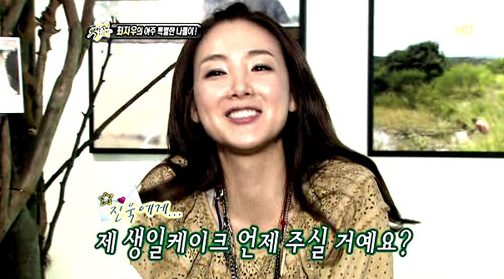 18일 방송된 MBC '섹션TV 연예통신'에 출연한 최지우는 자신의 36번째 생일을 맞아 리포터와 팬들이 축하 이벤트를 열어 준 것에 대해 고마움을 표시했는데 "군대에 계신 그 분께도 자축메시지를 보내달라"는 리포터의 요청에 "제 생일 케이크 언제 주실 건가요?"라는 애교 섞인 영상메시지를 보냈다.