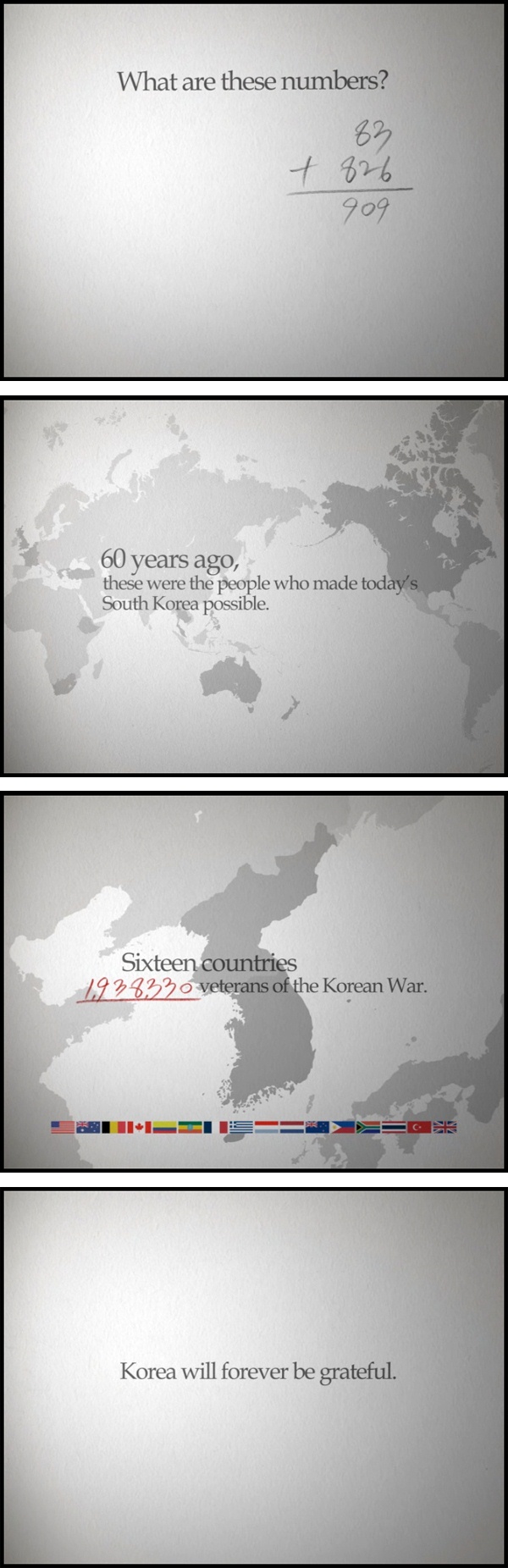 'What are these numbers?(이 숫자들은 무엇인가요?)'라는 제목의 이번 30초 영상광고는 룩셈부르크(83명), 남아공(826명) 등 16개 나라에서 참전한 많은 분들로 인해 평화를 얻을 수 있었고 이에 대해 감사한다는 내용의 콘셉트로 제작됐다. -