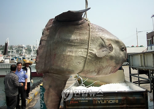 9일 오전 강원도 동해시 대진항 앞 해상에서 조업 중이던 동해선적의 정치망 어선이 그물에 걸려 죽어 있는 가로 2m, 세로 2.5m, 무게 300㎏ 되는 대형 개복치 1마리를 발견, 해경에 신고했다.