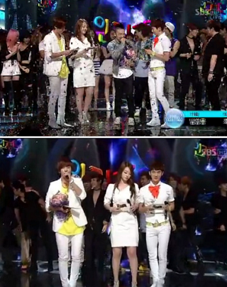 10cm 높이의 '킬힐'을 신은 에프엑스의 설리가 정용화-조권-태양 등 남성 가수들에게 굴욕을 안겼다.