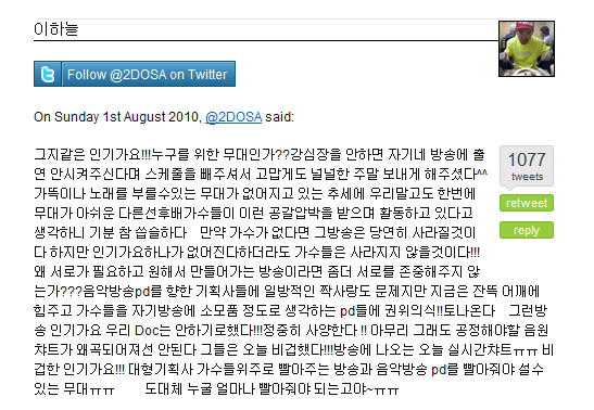 자신의 발언이 왜곡·보도된 것에 불만을 품고 언론사 기자들을 겨냥 "ㅅ ㅍ ㅂ ㅅ ㄱ ㅇ 기자야 멋대로 해명시키지 말아주세요ㅠㅠ"란 글을 트위터에 남겨 논란을 야기시켰던 DJ DOC의 이하늘이 이번엔 SBS 음악프로그램 '인기가요'를 맹비난하는 글을 올려 물의를 빚고 있다.
