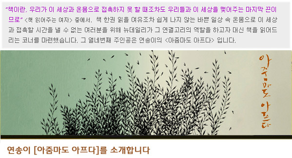 ‘아줌마도 아프다’는 한 여인의 현실과 이상 사이의 괴리감을 방송작가 특유의 재치 있는 입담으로 풀어낸 책이다. 사는 데 바빠, 식구들 챙기느라 정신없어 그 속살을 드러내 보일 여유가 없었을 뿐, 누구보다도 여린 속살을 가지고 있는 아줌마들의 감성을 신랄하게 통쾌하게 표현했다. 울고 웃으며 읽다 보면 공감과 위로 한 자락을 얻기에 충분하다.