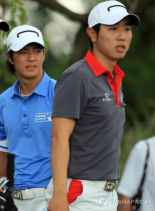 (한국 프로골프의 승부사 배상문(오른쪽,키움증권)과 일본의 슈퍼스타 이시카와 료 선수가 11일 제주 서귀포시 해비치골프장(파72)에서 열린 현대캐피탈 인비테이셔널 한일프로골프 국가대항전 2라운드에서 함께 라운딩 하고 있다.)