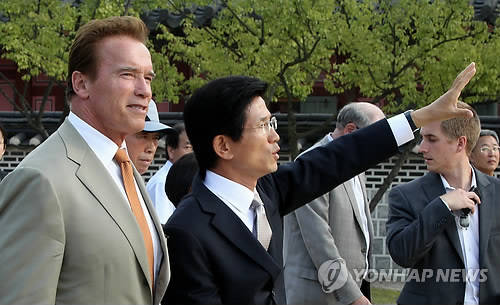 '터미네이터'로 유명한 전 영화배우 아널드 슈워제네거 미국 캘리포니아주지사가 14일 경기도 수원의 화성행궁(華城行宮)을 찾아 김문수 경기도지사와 '경기도와 캘리포니아주간 우호협력 양해각서(MOU)'를 맺었다.