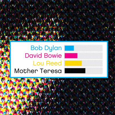 오른쪽은 위 포스터 우측 하단 일부를 확대한 모습. 한 구석에 마치 포토샵의 RGB 값을 나타내듯 청·적·황·흑의 비율이 표시되었다. 망점으로 보이던 점들 역시 그냥 점이 아니라 각 인물들의 얼굴 모습임을 확인할 수 있다.