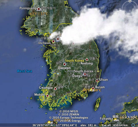 ▲ 21일 오후 3시 45분 구글어스 위성사진에 잡힌 한반도 상공의 비 구름대. -