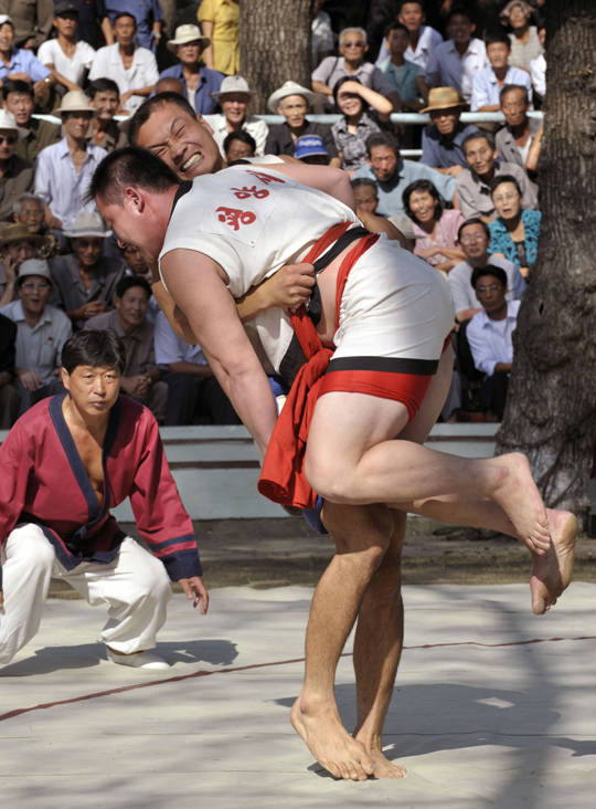 15일 평양 릉라도씨름경기장에서 열린 제8차 대황소상 전국민족씨름경기에서 평안북도의 리조원 선수가 1위를 하고 대황소와 금소방울을 수여 받은 후 기뻐하고 있다.북한에서도 씨름은 대표적인 민족체육으로 해마다 전국대회가 열린다. 그 중 2002년부터 추석 전후로 열리는 '대황소 씨름대회'가 가장 큰 대회다. 각 도에서 선발된 90여명의 선수들이 출전하는 이 대회는 7개 체급으로 나뉘어 경쟁하는 단체전과 체중제한이 없는 개인전인 '비교씨름경기'가 펼쳐진다.