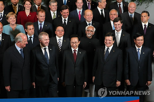 벨기에 브뤼셀 왕궁에서 4일 오후(현지시간) 열린 제8차 아시아-유럽 정상회의(ASEM)에 참석중인 이명박 대통령이 각국 정상들과 기념촬영을 하며 이야기를 나누고 있다.첫째줄 왼쪽부터 알버트 2세 벨기에 국왕, 이브 레테름 벨기에 총리, 이명박 대통령, 조제 마누엘 바호주 EU집행위원장,부아손 라오스 총리.