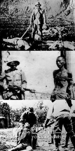 ▲2001년 한국사회문화연구원이 공개한 사진. 일본군이 일본도로 처형한 뒤 웃고 있다 (자료사진)보고서는 조선인의 집단 저항이 일본군의 식인사건 때문으로 보인다고 결론냈다.