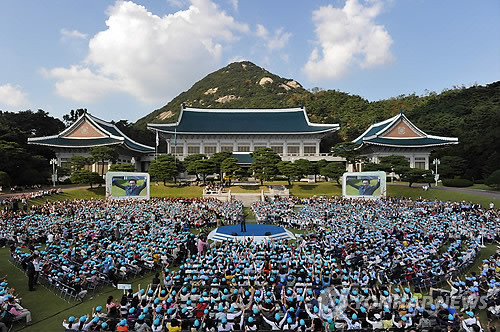 이 대통령은 당초 이 행사를 지난 3월 27일에 할 예정이었으나 천안함 사태로 연기하다 이날 한글날을 맞아 행사를 열게 됐다.