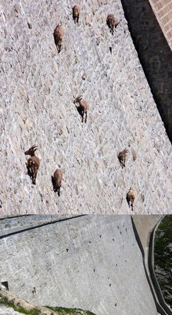 이 사진에서 야생염소 떼는 거의 수직으로 솟은 50m의 신지노(Chingino) 댐 장벽을 미끄러지지 않고 올라가고 있다. 또, 이들 중 몇몇 무리는 풀을 뜯듯이 암벽을 핥고 있다. 이같은 염소의 행동은 돌을 핥거나 흙을 섭취함으로써 부족한 소금과 미네랄을 보충하기 위해서라고 알려져있다.