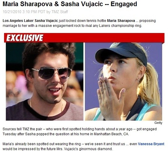 미국의 연예가십전문사이트 TMZ닷컴은 현지시각으로 21일 마리아 샤라포바와 LA 레이커스에서 활동 중인 농구 선수 사샤 사샤 부야치치(26)가 약혼했다고 보도했다.