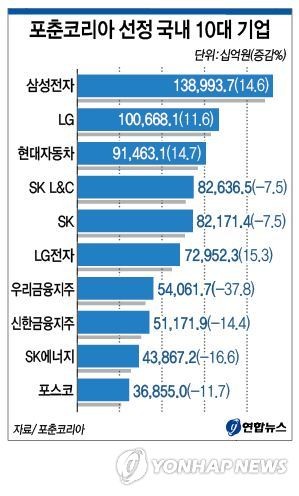 이밖에 신한금융지주, SK에너지, 포스코 등이 '톱 10' 안에 들었다.