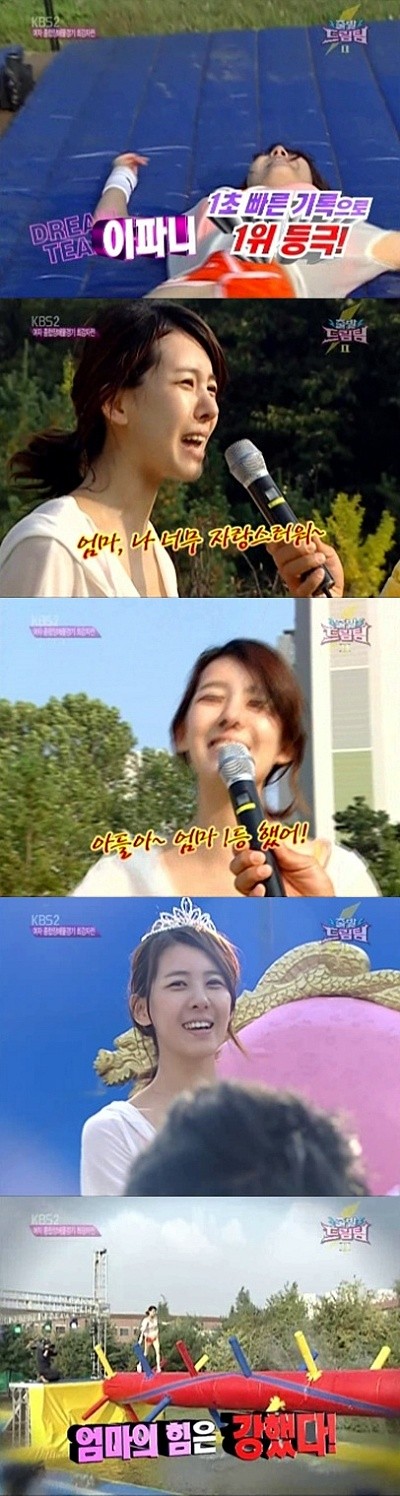 31일 오전 방송된 KBS2 ‘출발 드림팀’에서는 연예계 대표 여걸 20명의 ‘종합장애물 5종경기’가 펼쳐졌다.이날 이파니는 핸드볼 선수 출신에 무에타이로 다져진 운동 신경을 바탕으로 모두의 기대를 깨고 58초48이라는 놀라운 기록으로 우승을 차지했다. '운동돌' 시크릿의 전효성을 1초 차로 누르고 ‘여왕 자리’에 등극했다.