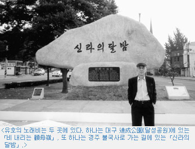 「비 내리는 고모령」도 사연이 있다. 兪湖는 朴是春으로부터 作詞(작사) 부탁을 받고 서울중앙방송국 도서관으로 갔다. 벽에 붙어 있는 커다란 한국 全圖(전도)를 보니 東大邱(동대구)역 옆에 급행 열차도 서지 않는 顧母驛(고모역)이 눈에 띄었다. 顧母驛이라는 漢字가 무슨 사연을 간직한 것 같았다. 그는 가사를 적어 내려갔다. 이 노래는 1948년 가수 玄仁씨의 특유한 低音(저음)에 실려 인기를 모았다.